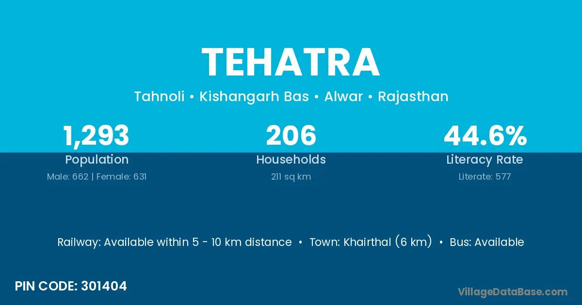 Khairthal (6 km) is the nearest town to Tehatra village for major economic activities and is located approximately 6 km away.