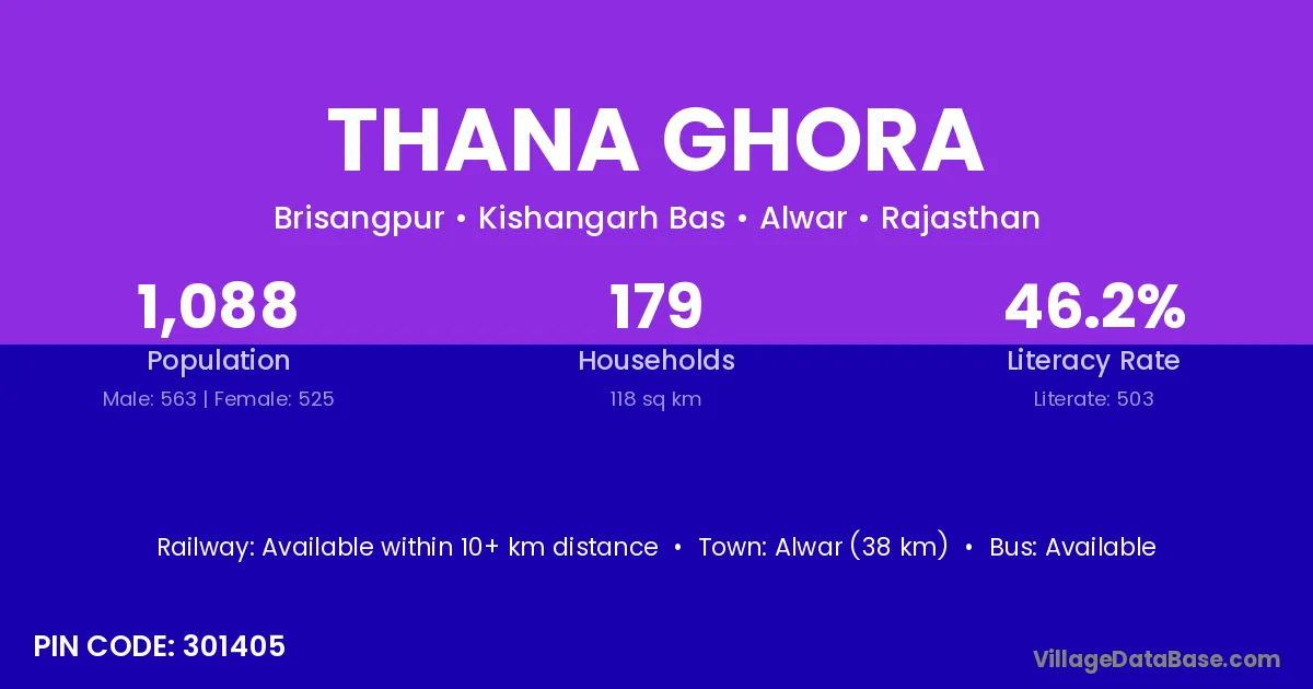 Alwar (38 km) is the nearest town to Thana Ghora village for major economic activities and is located approximately 38 km away.