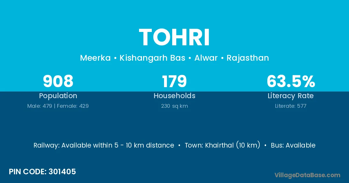 Khairthal (10 km) is the nearest town to Tohri village for major economic activities and is located approximately 10 km away.