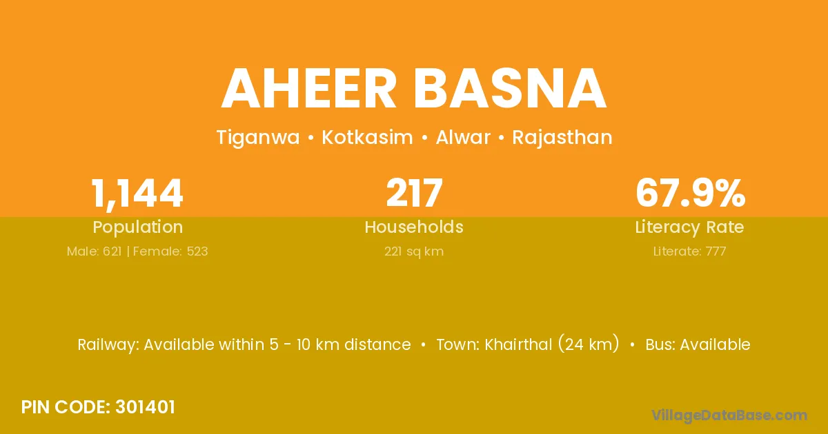 Khairthal (24 km) is the nearest town to Aheer Basna village for major economic activities and is located approximately 24 km away.