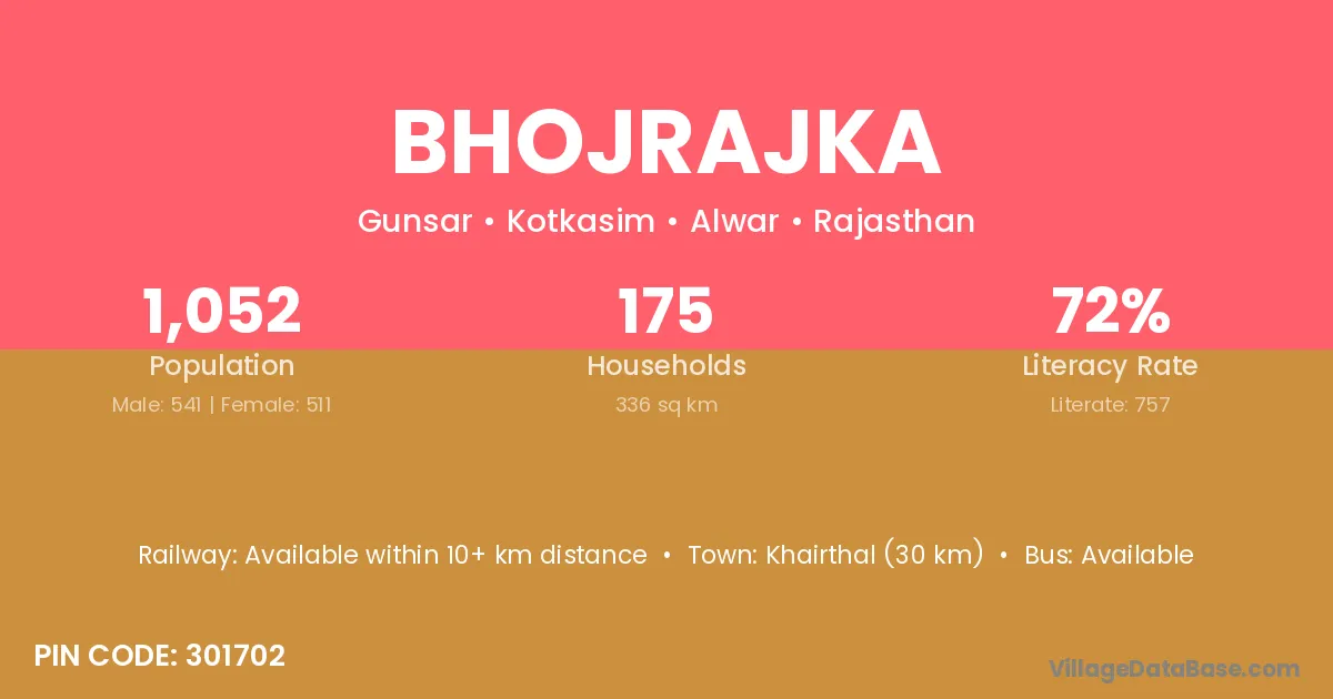 Khairthal (30 km) is the nearest town to Bhojrajka village for major economic activities and is located approximately 30 km away.