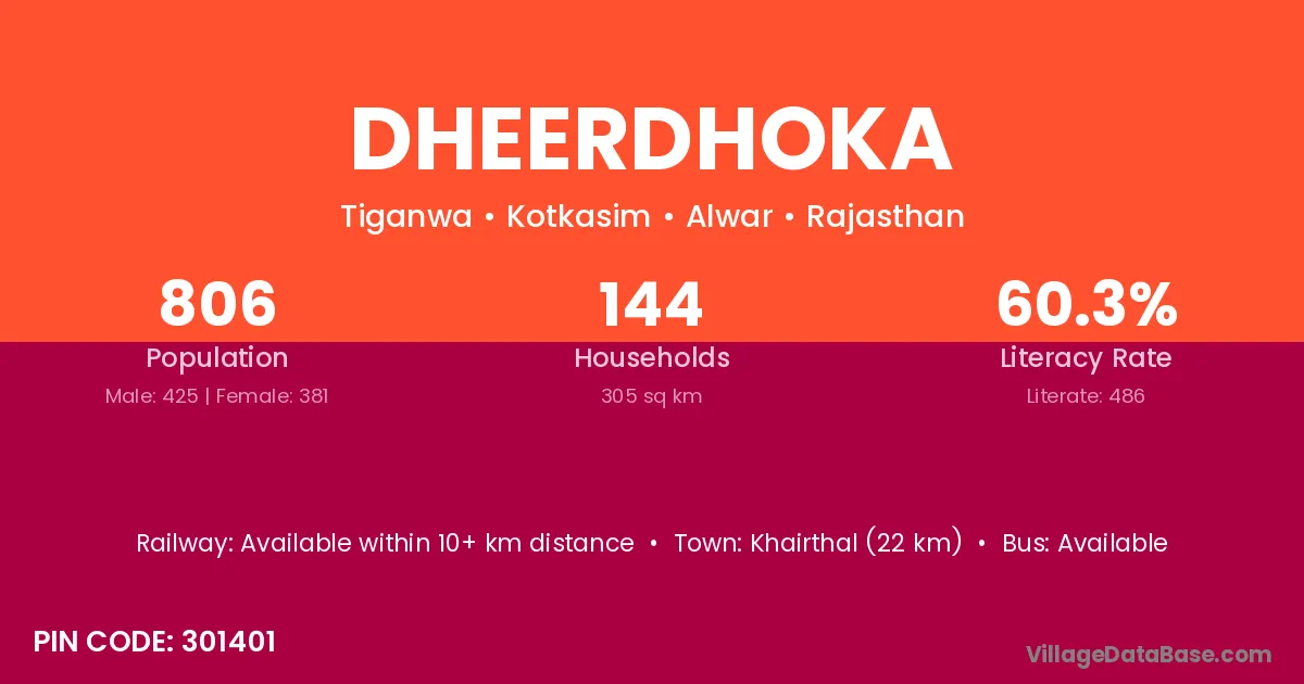 According to Census 2011 information, the village code of Dheerdhoka village is 301401.
