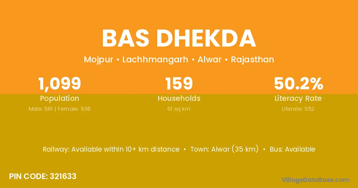 Alwar (35 km) is the nearest town to Bas Dhekda village for major economic activities and is located approximately 35 km away.