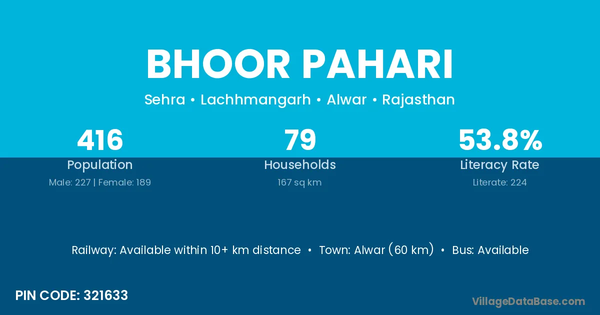 Alwar (60 km) is the nearest town to Bhoor Pahari village for major economic activities and is located approximately 60 km away.