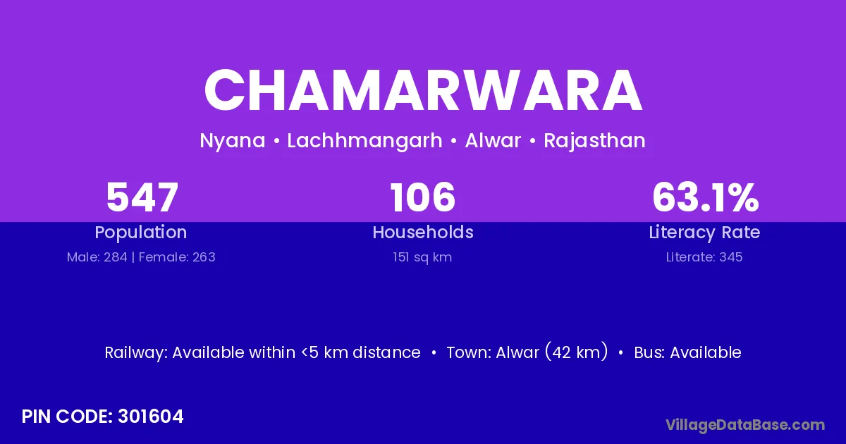 Alwar (42 km) is the nearest town to Chamarwara village for major economic activities and is located approximately 42 km away.
