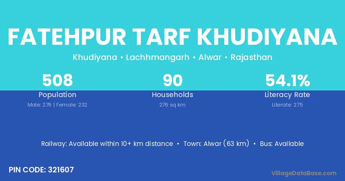 Alwar (63 km) is the nearest town to Fatehpur Tarf Khudiyana village for major economic activities and is located approximately 63 km away.