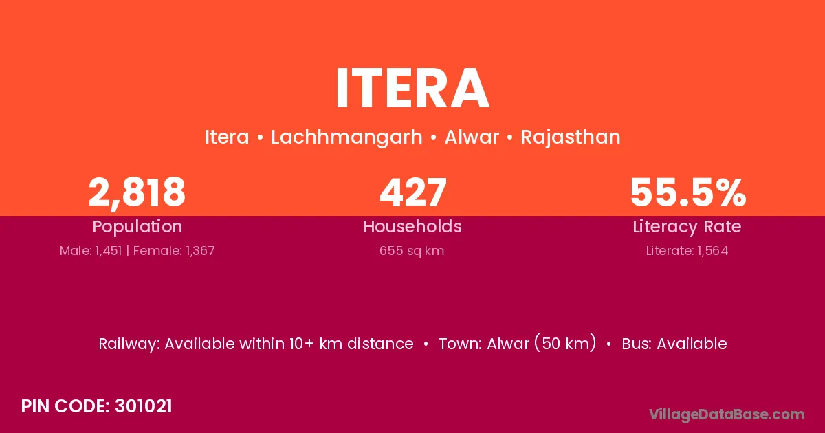 Alwar (50 km) is the nearest town to Itera village for major economic activities and is located approximately 50 km away.