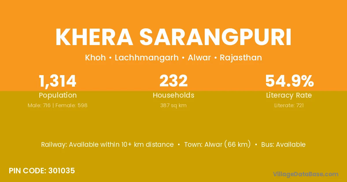 Alwar (66 km) is the nearest town to Khera Sarangpuri village for major economic activities and is located approximately 66 km away.