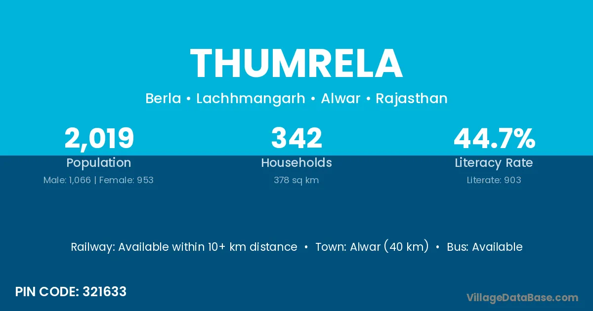 Alwar (40 km) is the nearest town to Thumrela village for major economic activities and is located approximately 40 km away.