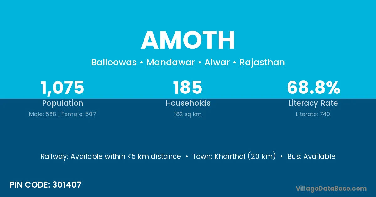 Khairthal (20 km) is the nearest town to Amoth village for major economic activities and is located approximately 20 km away.