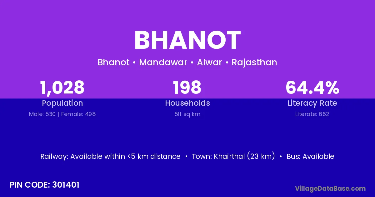 Khairthal (23 km) is the nearest town to Bhanot village for major economic activities and is located approximately 23 km away.