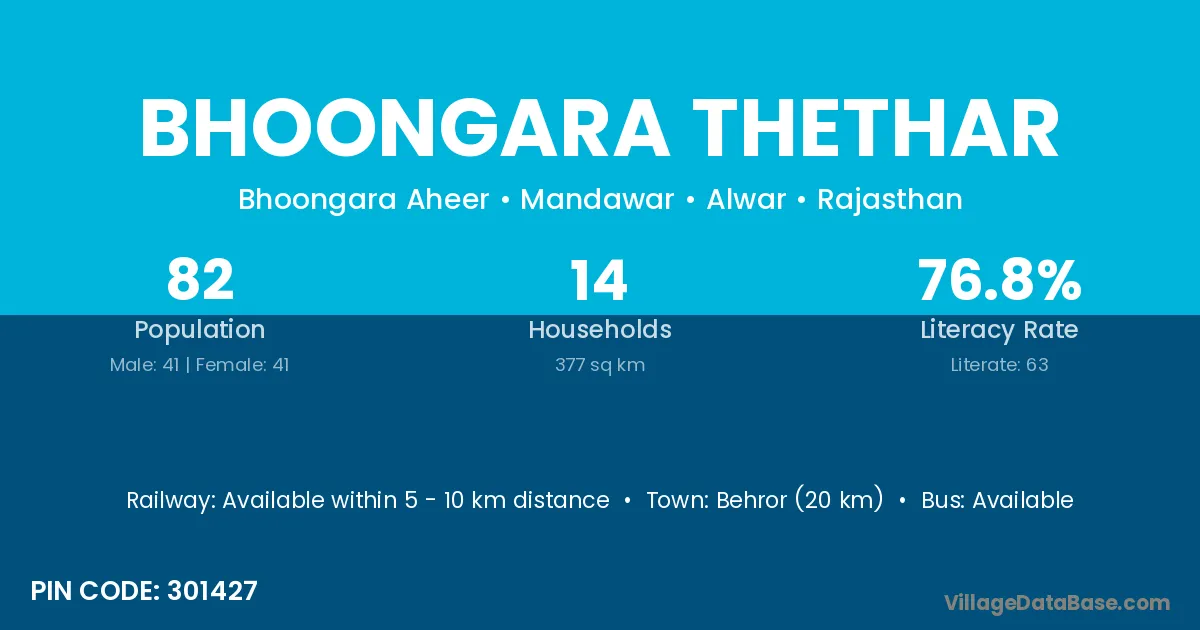 Behror (20 km) is the nearest town to Bhoongara Thethar village for major economic activities and is located approximately 20 km away.