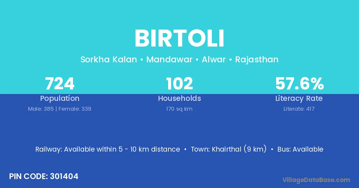 Khairthal (9 km) is the nearest town to Birtoli village for major economic activities and is located approximately 9 km away.