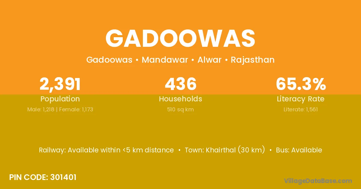 Khairthal (30 km) is the nearest town to Gadoowas village for major economic activities and is located approximately 30 km away.
