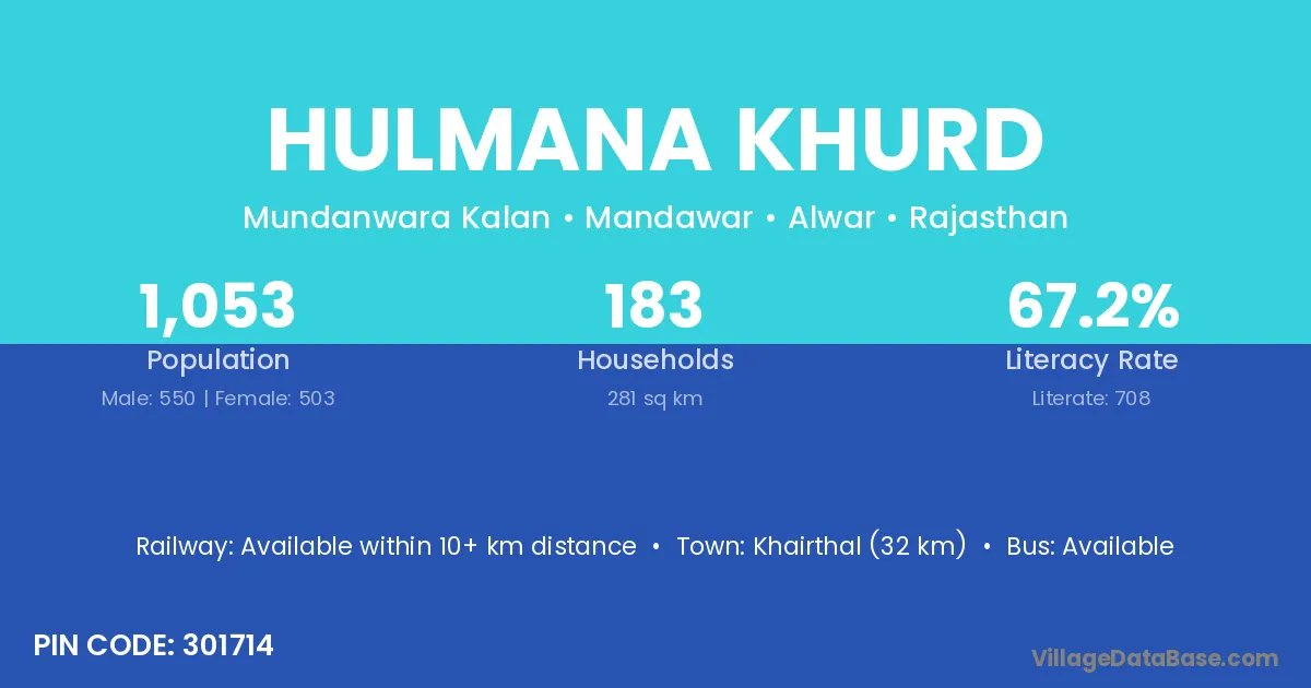 Khairthal (32 km) is the nearest town to Hulmana Khurd village for major economic activities and is located approximately 32 km away.