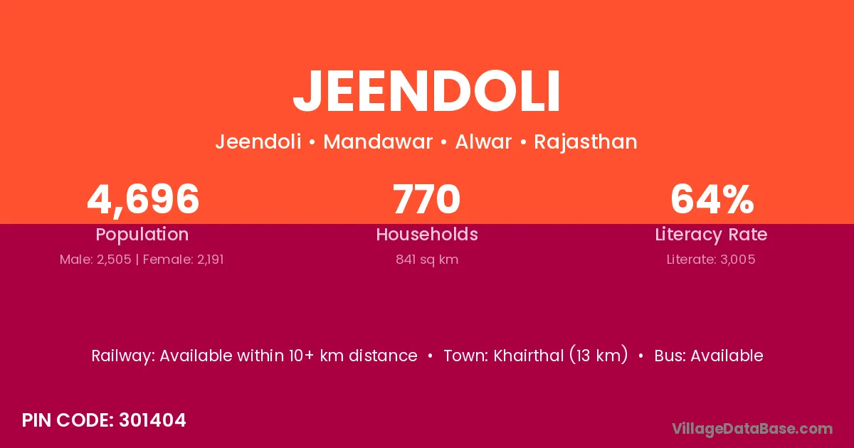 Khairthal (13 km) is the nearest town to Jeendoli village for major economic activities and is located approximately 13 km away.
