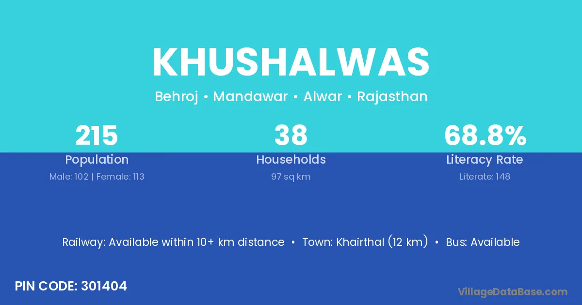 Khairthal (12 km) is the nearest town to Khushalwas village for major economic activities and is located approximately 12 km away.