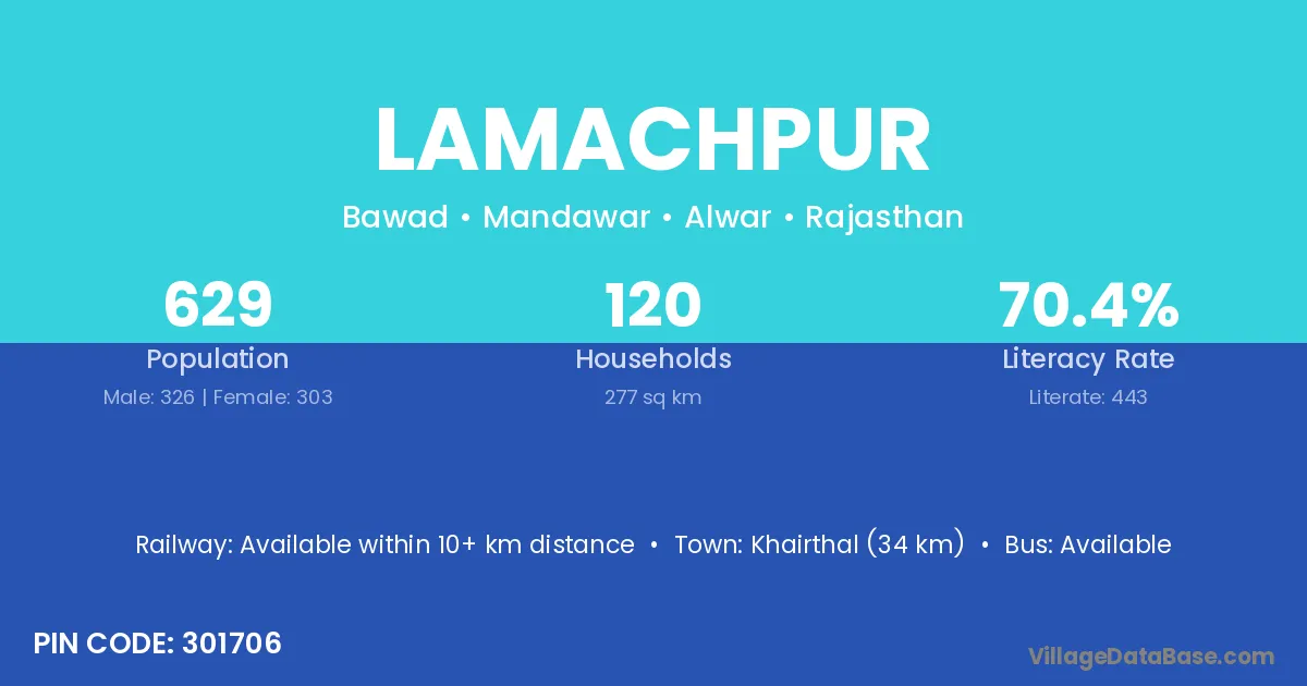Khairthal (34 km) is the nearest town to Lamachpur village for major economic activities and is located approximately 34 km away.