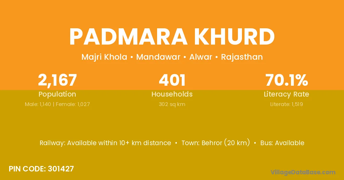 Behror (20 km) is the nearest town to Padmara Khurd village for major economic activities and is located approximately 20 km away.