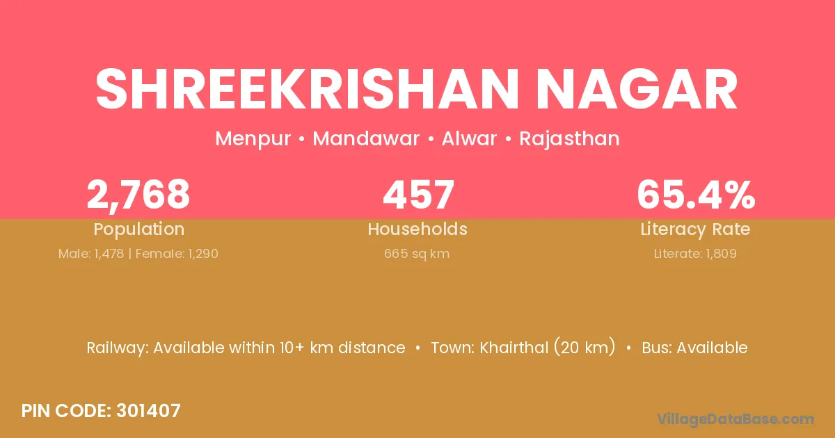 Khairthal (20 km) is the nearest town to Shreekrishan Nagar village for major economic activities and is located approximately 20 km away.