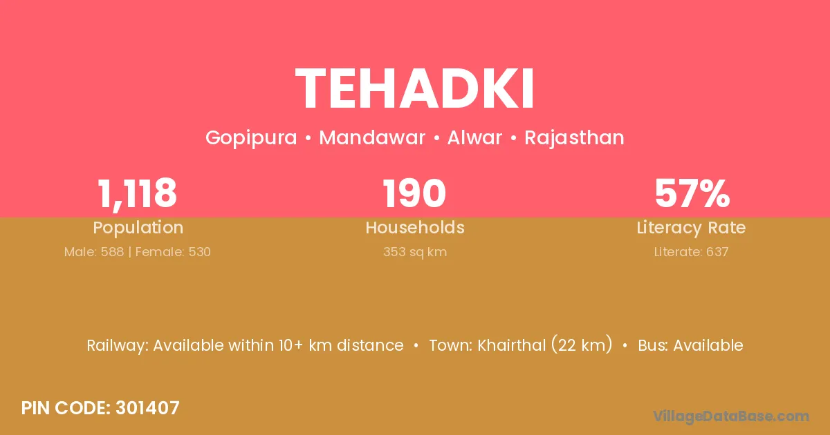 Khairthal (22 km) is the nearest town to Tehadki village for major economic activities and is located approximately 22 km away.