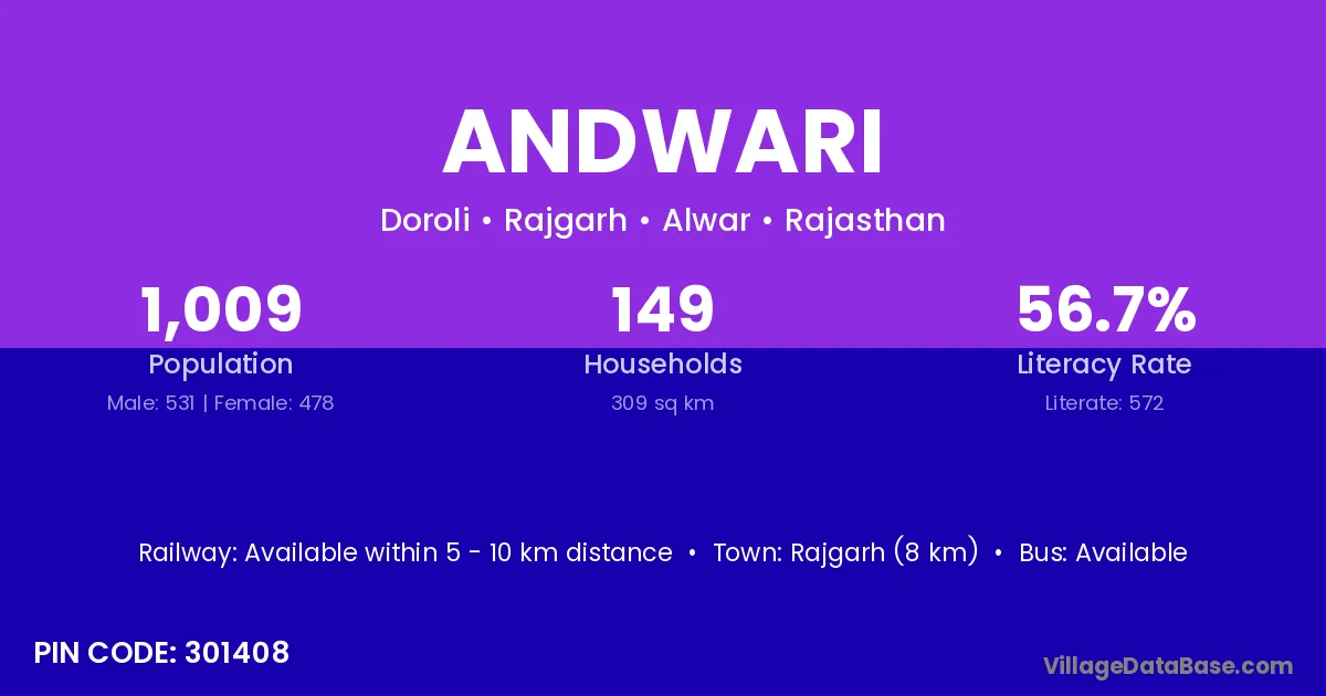 Rajgarh (8 km) is the nearest town to Andwari village for major economic activities and is located approximately 8 km away.