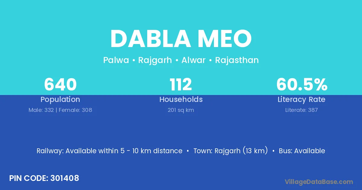 Rajgarh (13 km) is the nearest town to Dabla Meo village for major economic activities and is located approximately 13 km away.