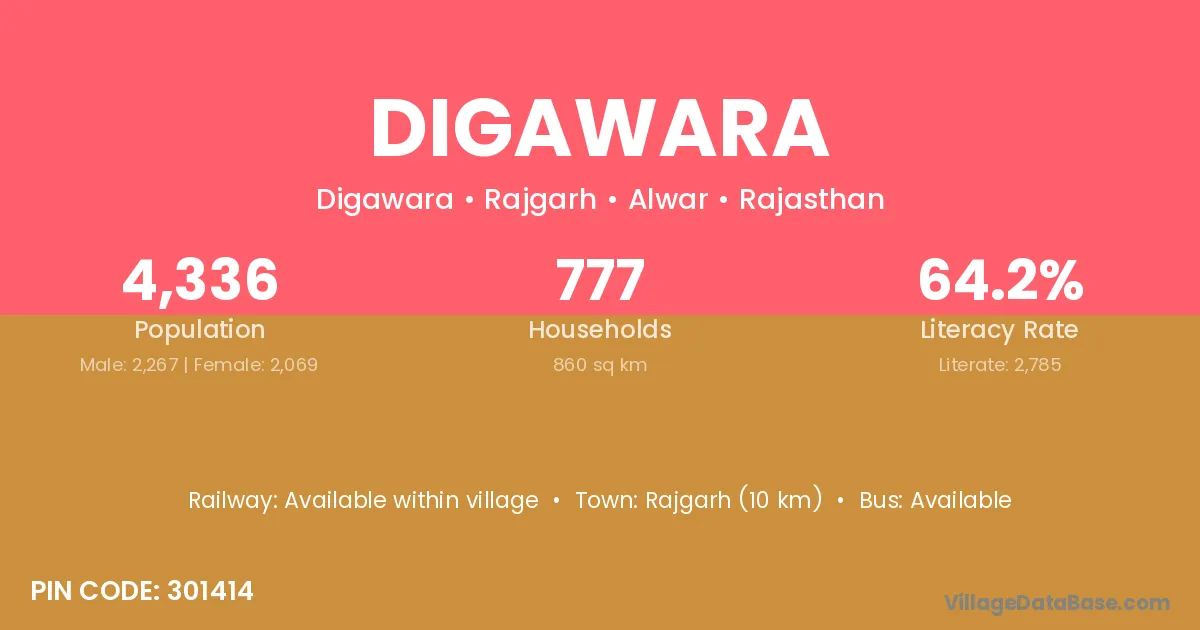 Digawara village has a total population of 4,336 people, of which 2,267 are males and 2,069 are females.