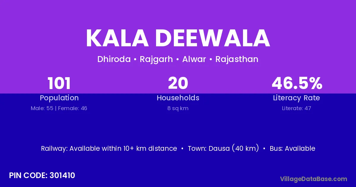 Dausa (40 km) is the nearest town to Kala Deewala village for major economic activities and is located approximately 40 km away.