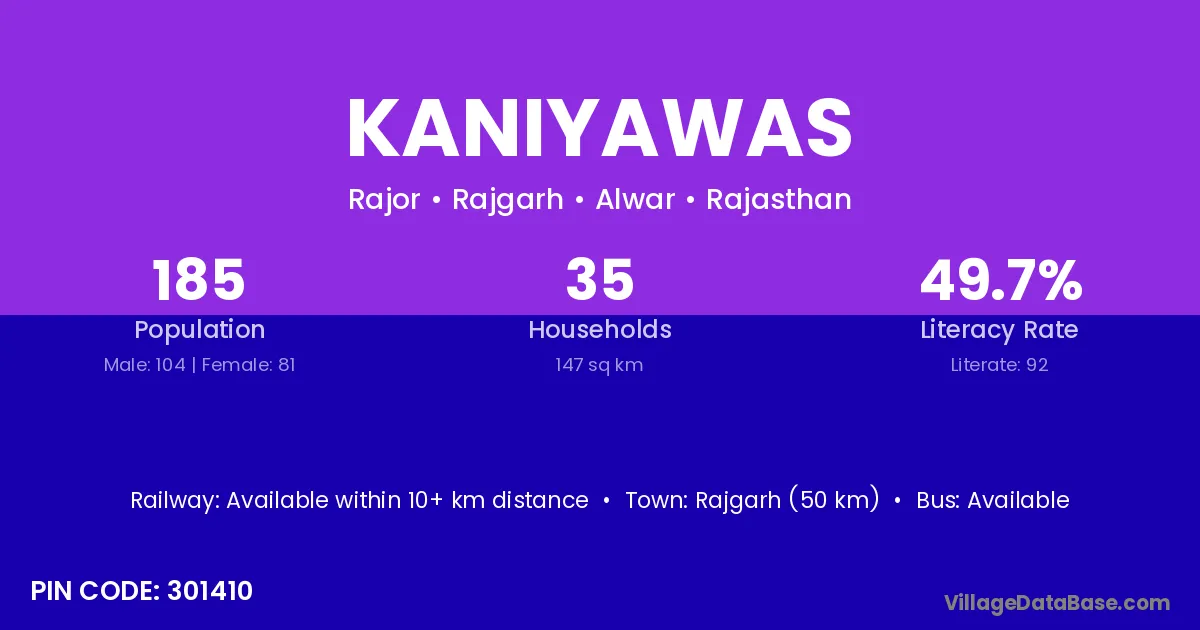 Rajgarh (50 km) is the nearest town to Kaniyawas village for major economic activities and is located approximately 50 km away.