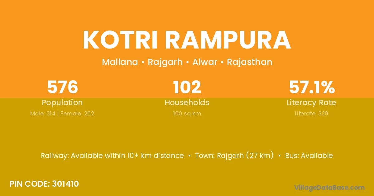Rajgarh (27 km) is the nearest town to Kotri Rampura village for major economic activities and is located approximately 27 km away.