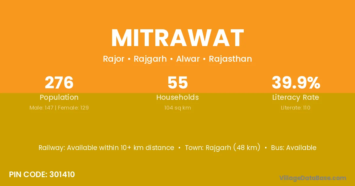 Rajgarh (48 km) is the nearest town to Mitrawat village for major economic activities and is located approximately 48 km away.