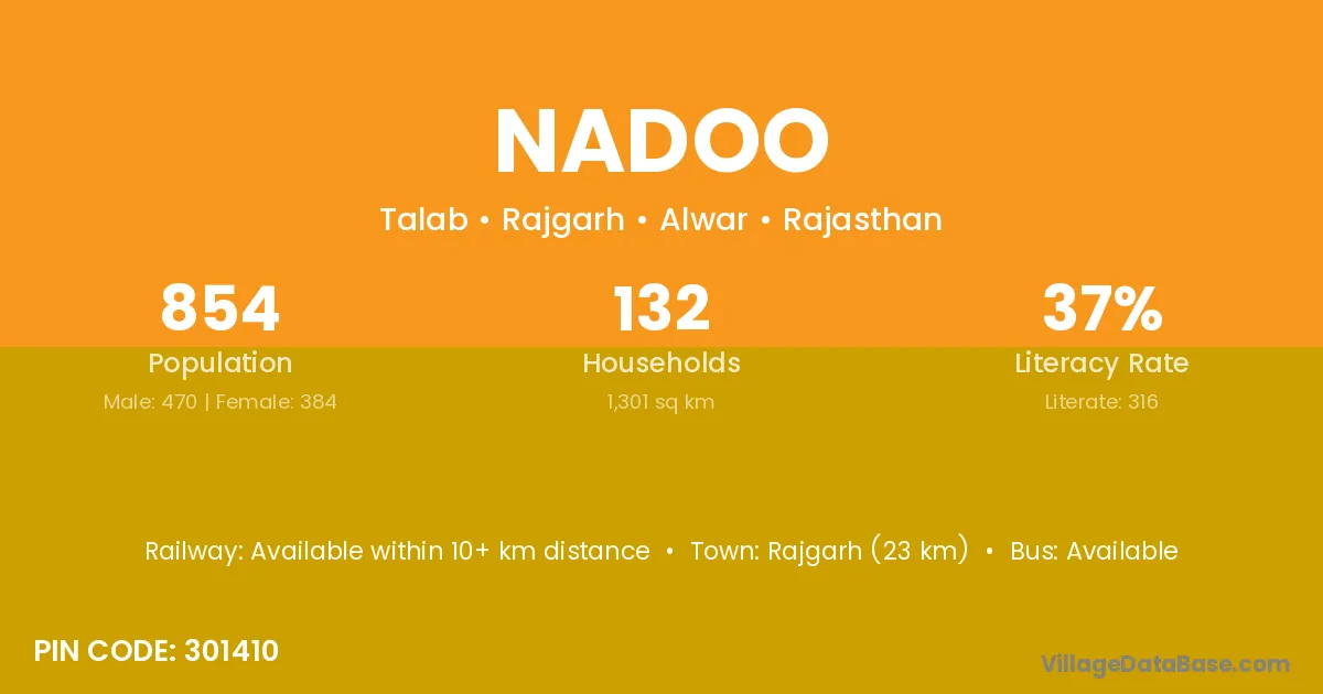 Rajgarh (23 km) is the nearest town to Nadoo village for major economic activities and is located approximately 23 km away.