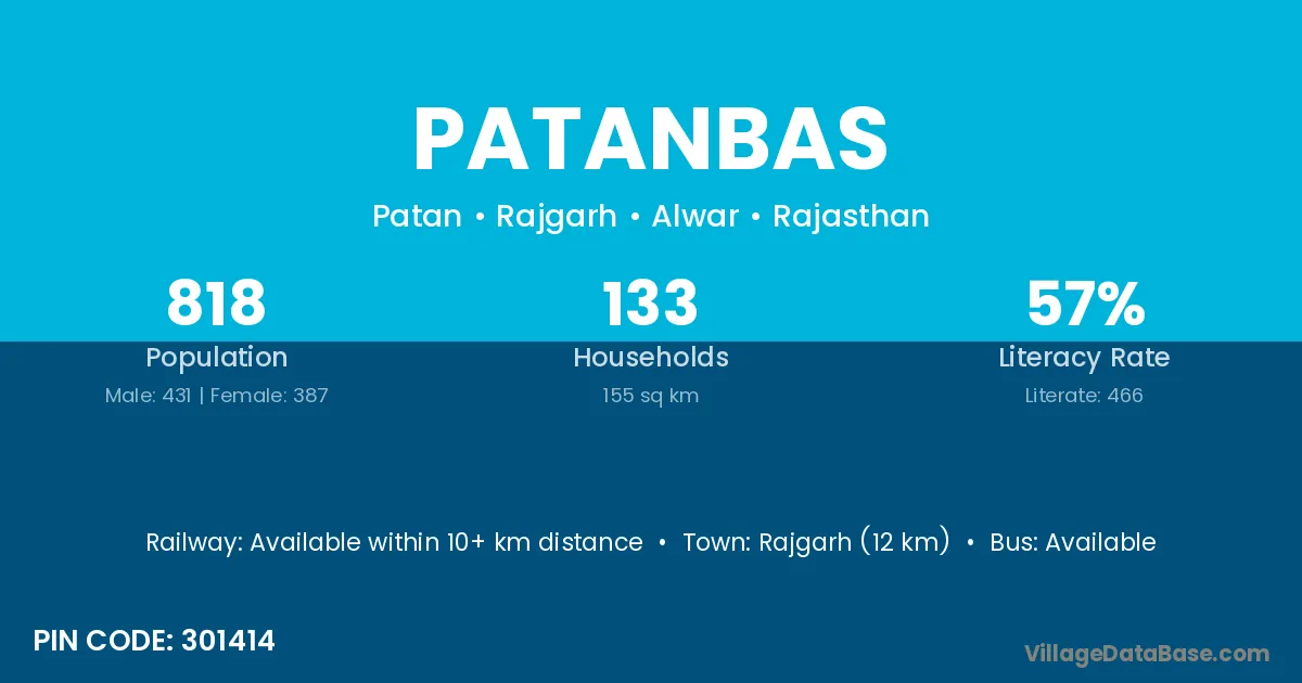 Rajgarh (12 km) is the nearest town to Patanbas village for major economic activities and is located approximately 12 km away.