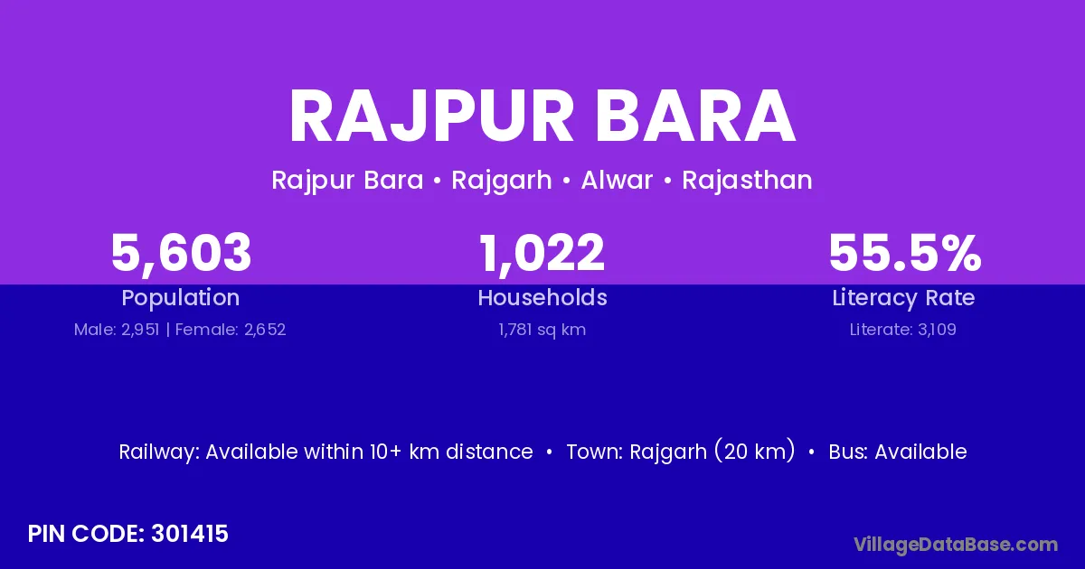 Rajgarh (20 km) is the nearest town to Rajpur Bara village for major economic activities and is located approximately 20 km away.