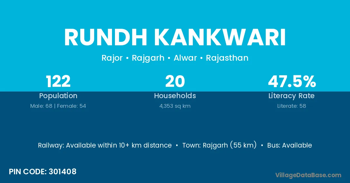 Rajgarh (55 km) is the nearest town to Rundh Kankwari village for major economic activities and is located approximately 55 km away.