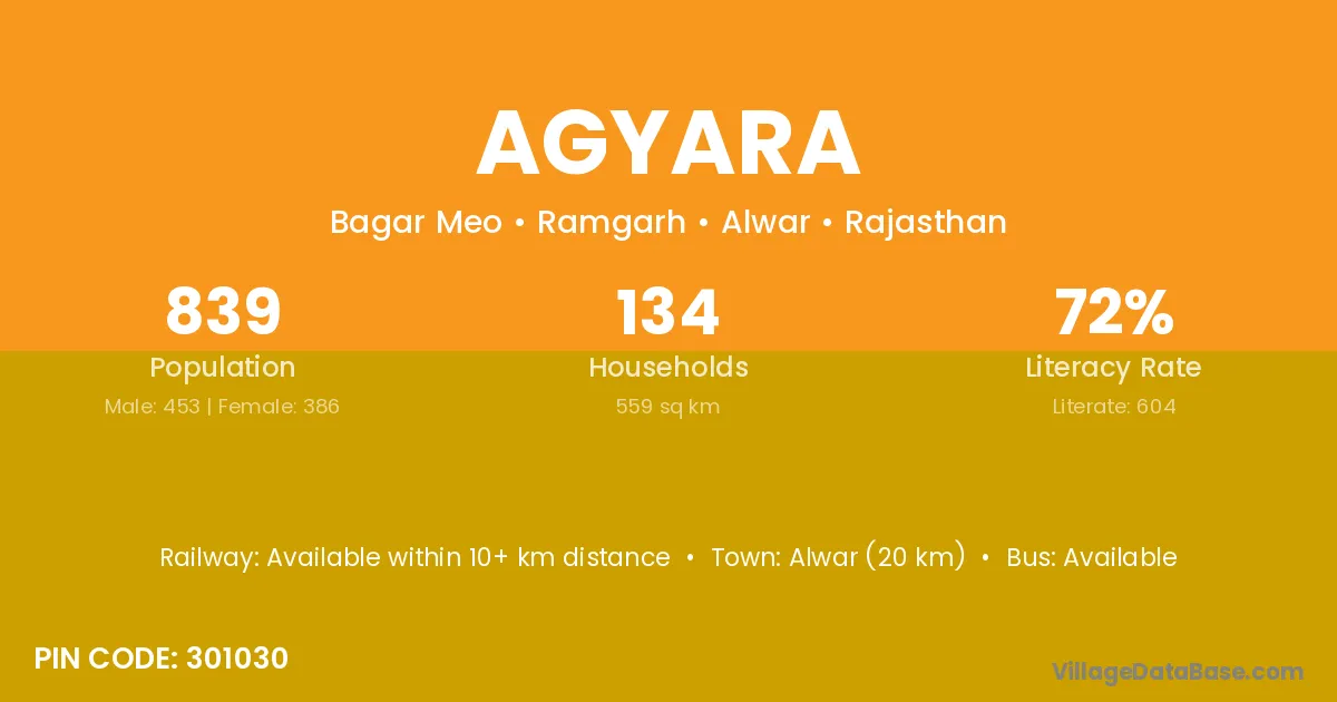 Alwar (20 km) is the nearest town to Agyara village for major economic activities and is located approximately 20 km away.