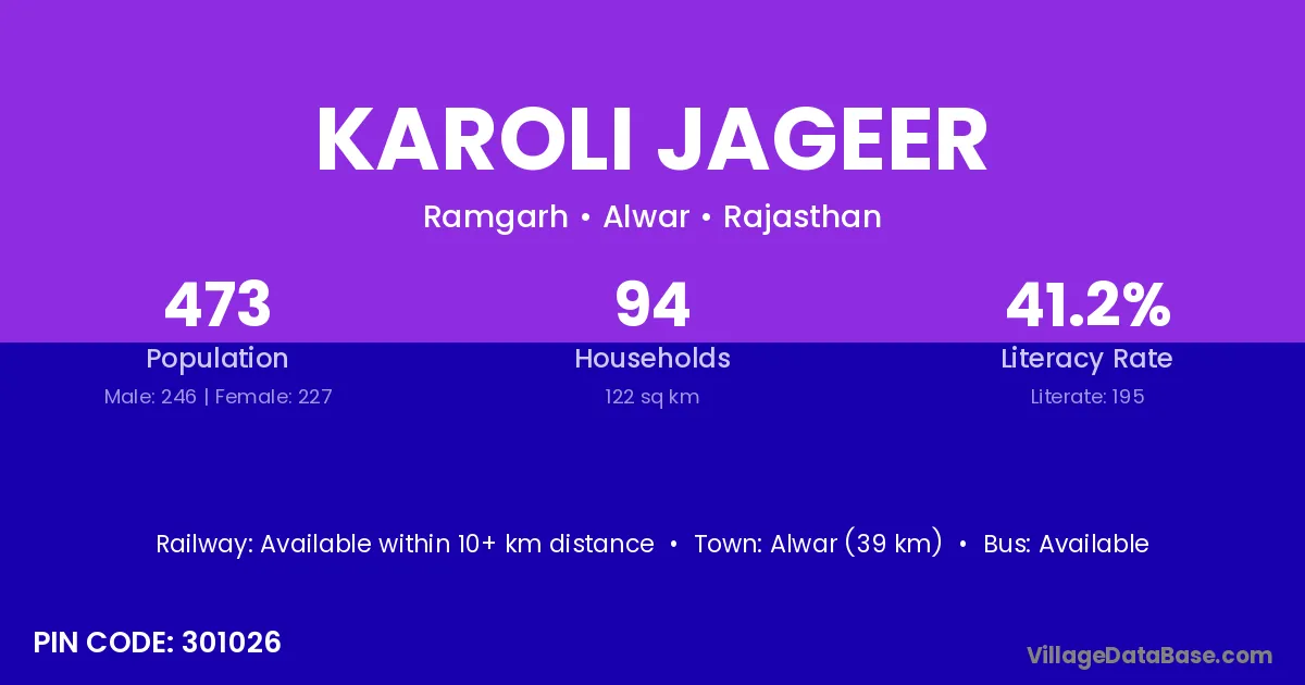Alwar (39 km) is the nearest town to Karoli Jageer village for major economic activities and is located approximately 39 km away.