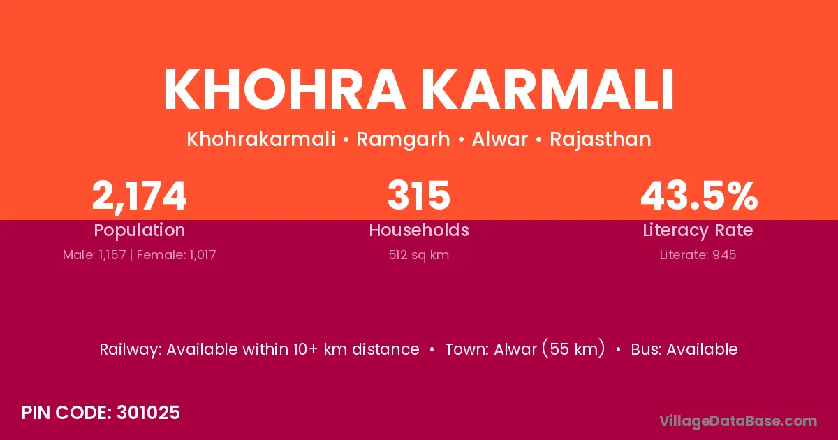 Alwar (55 km) is the nearest town to Khohra Karmali village for major economic activities and is located approximately 55 km away.