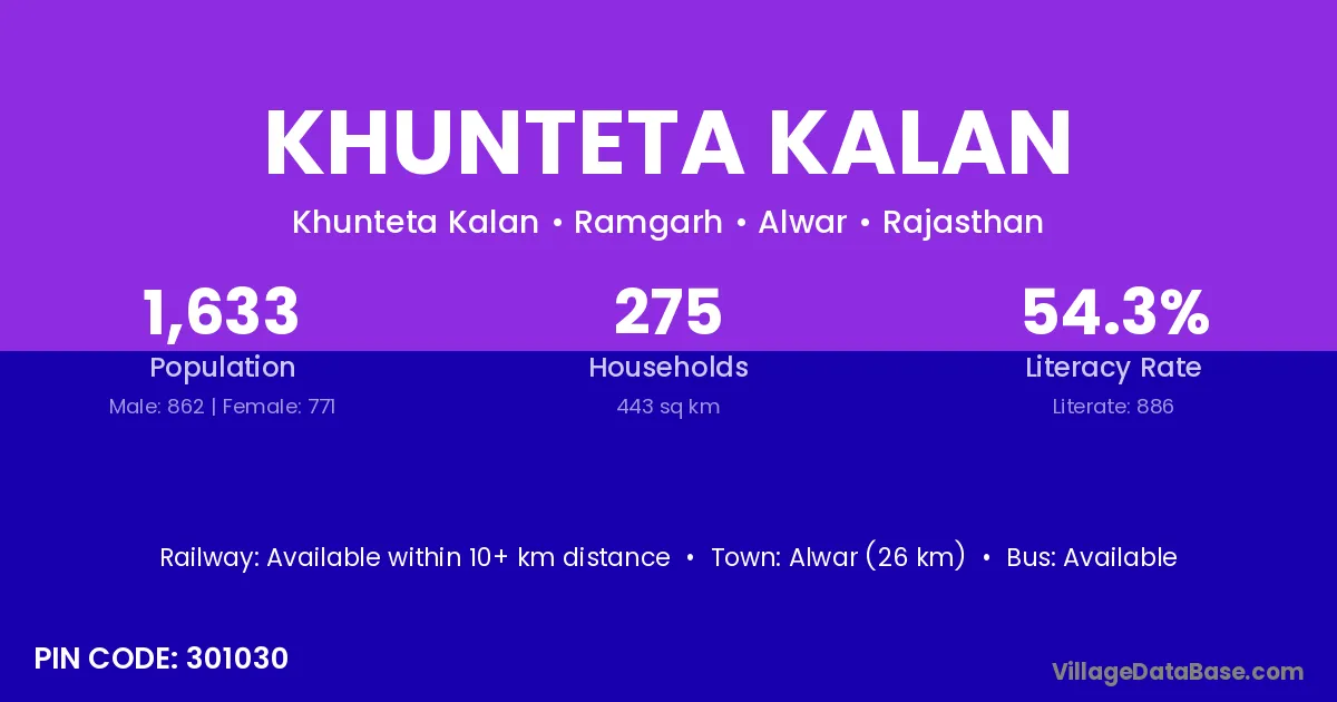 Alwar (26 km) is the nearest town to Khunteta Kalan village for major economic activities and is located approximately 26 km away.