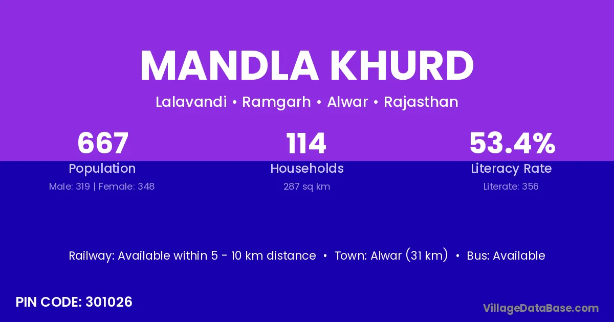 Alwar (31 km) is the nearest town to Mandla Khurd village for major economic activities and is located approximately 31 km away.