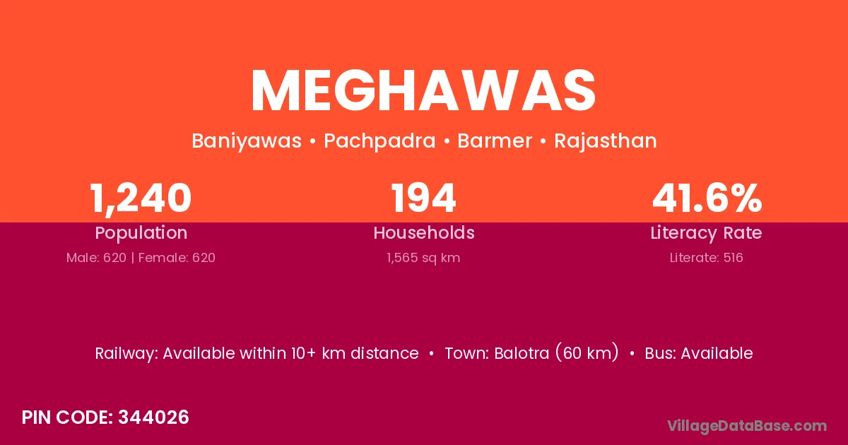 According to Census 2011 information, the village code of Meghawas village is 301025.