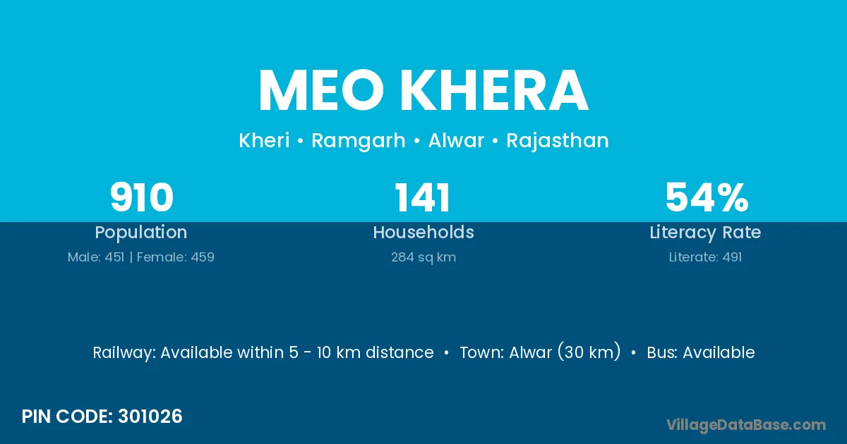 Alwar (30 km) is the nearest town to Meo Khera village for major economic activities and is located approximately 30 km away.
