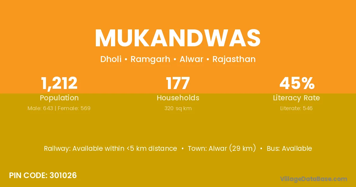 Alwar (29 km) is the nearest town to Mukandwas village for major economic activities and is located approximately 29 km away.