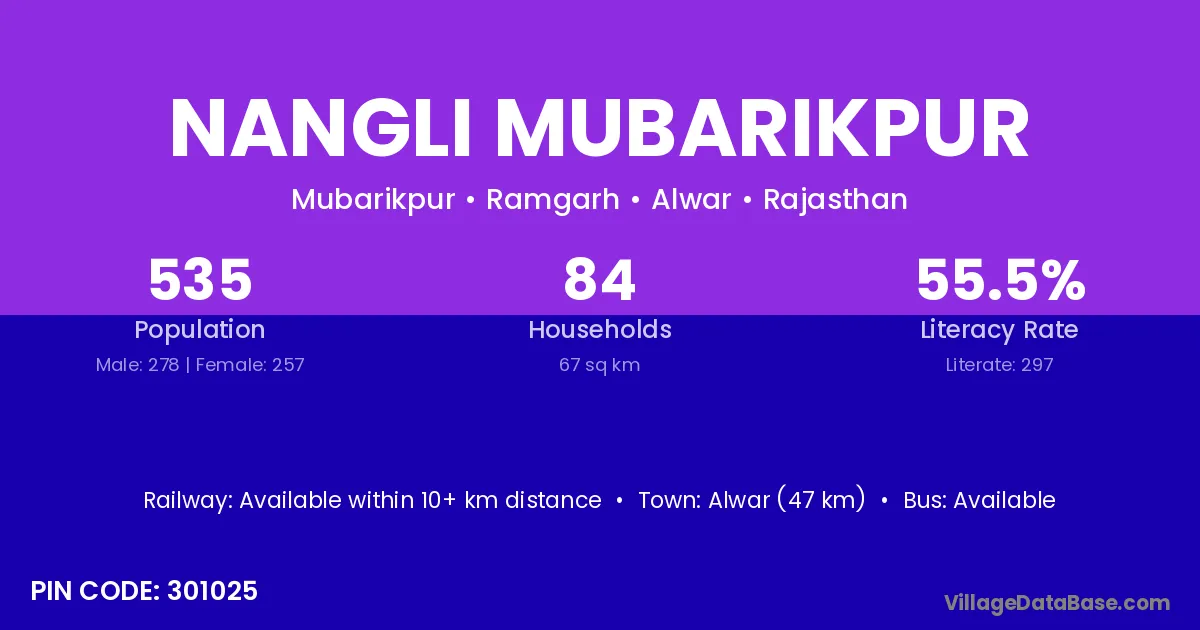 Alwar (47 km) is the nearest town to Nangli Mubarikpur village for major economic activities and is located approximately 47 km away.