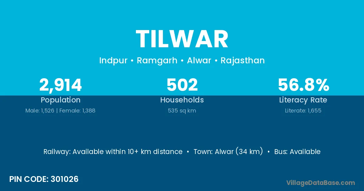 According to Census 2011 information, the village code of Tilwar village is 301026.