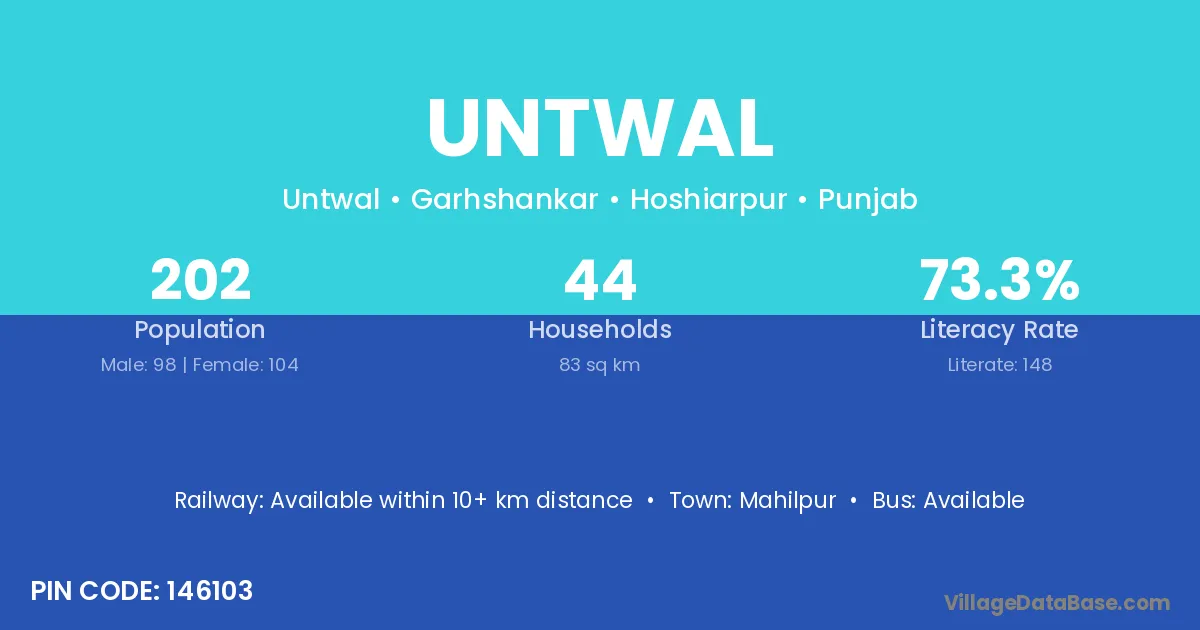 The literacy rate of Untwal village is 50.37%. Male literacy stands at 61.37% and female literacy at 37.90%.