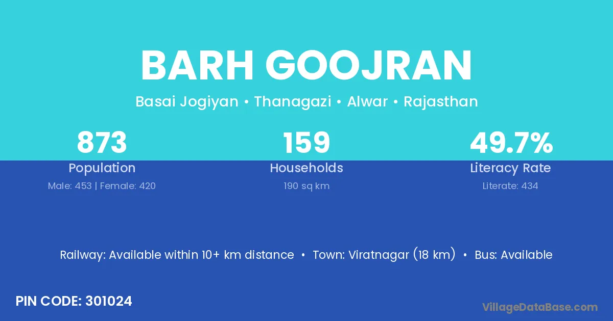 Viratnagar (18 km) is the nearest town to Barh Goojran village for major economic activities and is located approximately 18 km away.