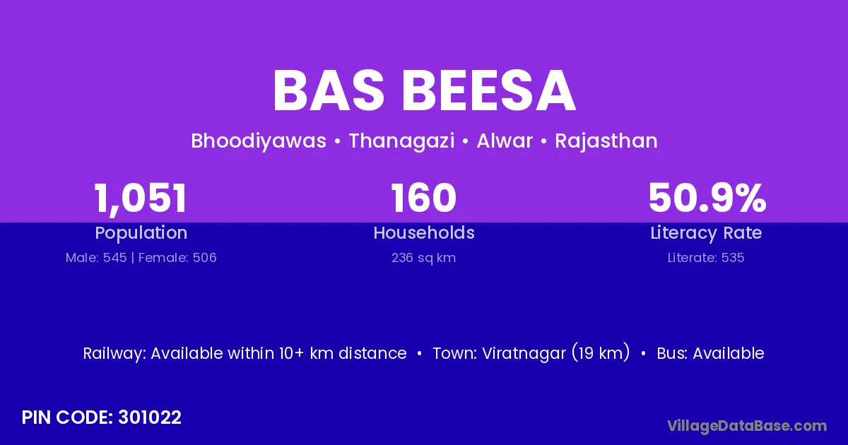 Viratnagar (19 km) is the nearest town to Bas Beesa village for major economic activities and is located approximately 19 km away.