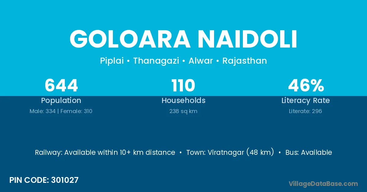 Viratnagar (48 km) is the nearest town to Goloara Naidoli village for major economic activities and is located approximately 48 km away.